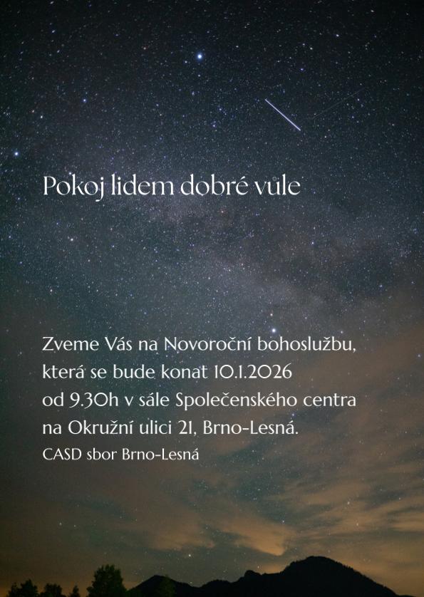 Pokoj lidem dobré vůle Příspěvek byl publikován5.12.2025 Rubriky příspěvkuPozvánky Zveme Vás na Novoroční bohoslužbu,která se bude konat 10.1.2026od 9.30h v sále Společenského centrana Okružní ulici 21, Brno-Lesná.CASD sbor Brno-Lesná Tisk Sdílet: Mohlo by se Vám také líbit Sobotní vycházka 23.9.2017 4.9.2017 Rozhlasová bohoslužba ze sboru Brno-Střední 12.11.2016 Odpoledne se studenty Teologického semináře 9.11.2012